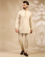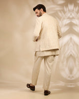 This bandhgala set features a ivory base adorned with subtle textured embroidery. Tailored in a structured silhouette and paired with ivory tonal kurta and trousers, it offers a graceful and contemporary look perfect for elegant festive occasions.