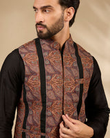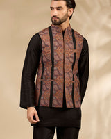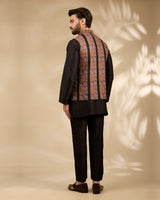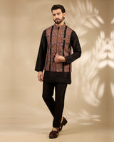 A refined fusion of heritage and modern sophistication, this bandi jacket set showcases black base fabric with intricate rich rust-toned vertical embroidery. Tailored in a structured silhouette and paired with a sleek black kurta and trousers, it creates a sharp, elongated look ideal for festive occasions and evening celebrations.