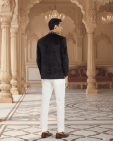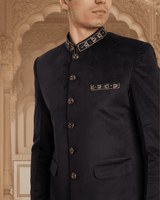 Featuring a black suede velvet bandhgala with golden thread collar embroidery.