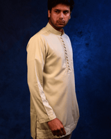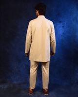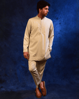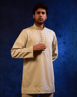 Crafted in a refined ivory-toned fabric, this kurta pajama set features a clean, solid design enhanced with subtle detailing along the placket and neckline. Designed with a straight-cut kurta silhouette and a band collar. Paired with tailored matching pajamas, this ensemble is perfect for daytime celebrations, cultural gatherings, and understated festive wear.