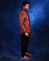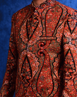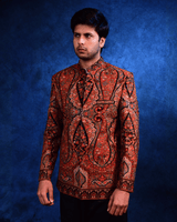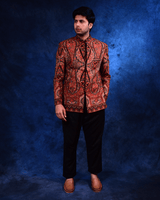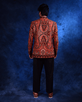 Crafted in a richly textured fabric, this bandhgala features an intricate embroidered design with ornate paisley .The warm rust red base, highlighted with detailed embroidery and contrasting accents. Tailored in a structured bandhgala silhouette with a refined band collar. Paired with black tailored trousers, this ensemble is ideal for festive evenings, weddings, and formal occasions.