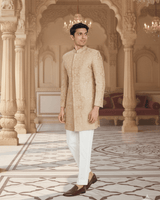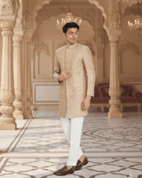 Featuring a beige embriodered sherwani with tone on tone thread and sequin embroidery. It is paired with white trousers.