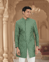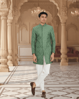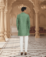 Featuring a green embriodered sherwani with tone on tone thread and sequin embroidery. It is paired with white trousers.