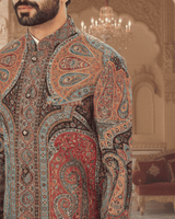 Featuring a black base jamawar weaved sherwani set. It is paired with white trousers.