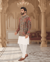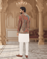 Featuring a multi color jamawar weaved bandhgala