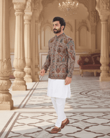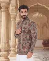 Featuring a brown jamawar weaved bandhgala